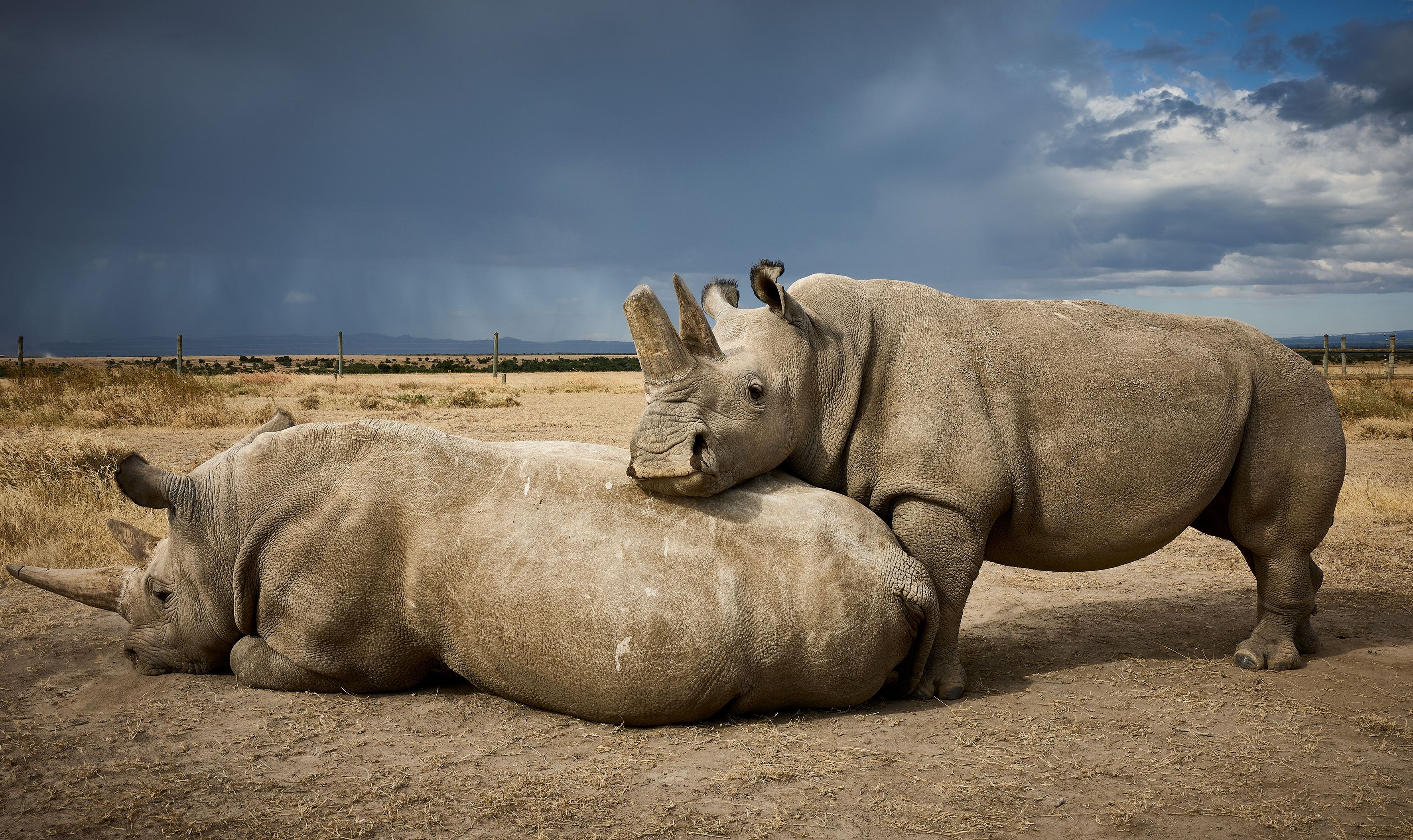 Captured on the open plains of Namibia, two rhinos rest beneath a boundless sky—an image of quiet power and endurance. The photograph reflects both the majesty and fragility of life in the wild, where strength and grace exist in perfect balance.